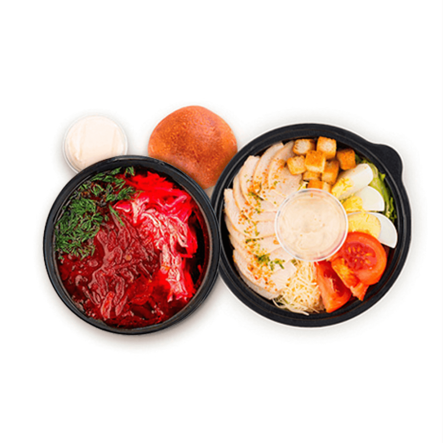 Борщ горячий Бульон куриный натуральный Филе куриное Картофель Свекла Морковь Лук Зелень Продукт Сметанный Сметана Продукт сметанный Цезарь с курицей Салат Помидор Яйцо Филе куриное фри Сыр пармезан Сухарики Соус Булочка Булочка свежеиспеченная