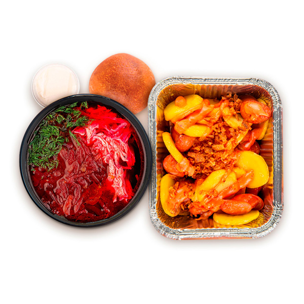 Борщ горячий Бульон куриный натуральный Филе куриное Картофель Свекла Морковь Лук Зелень Продукт Сметанный Потейтос Фирменный Картофель Колбаска Карпатская Лук фри Соус Сметана Продукт сметанный Булочка Булочка свежеиспеченная